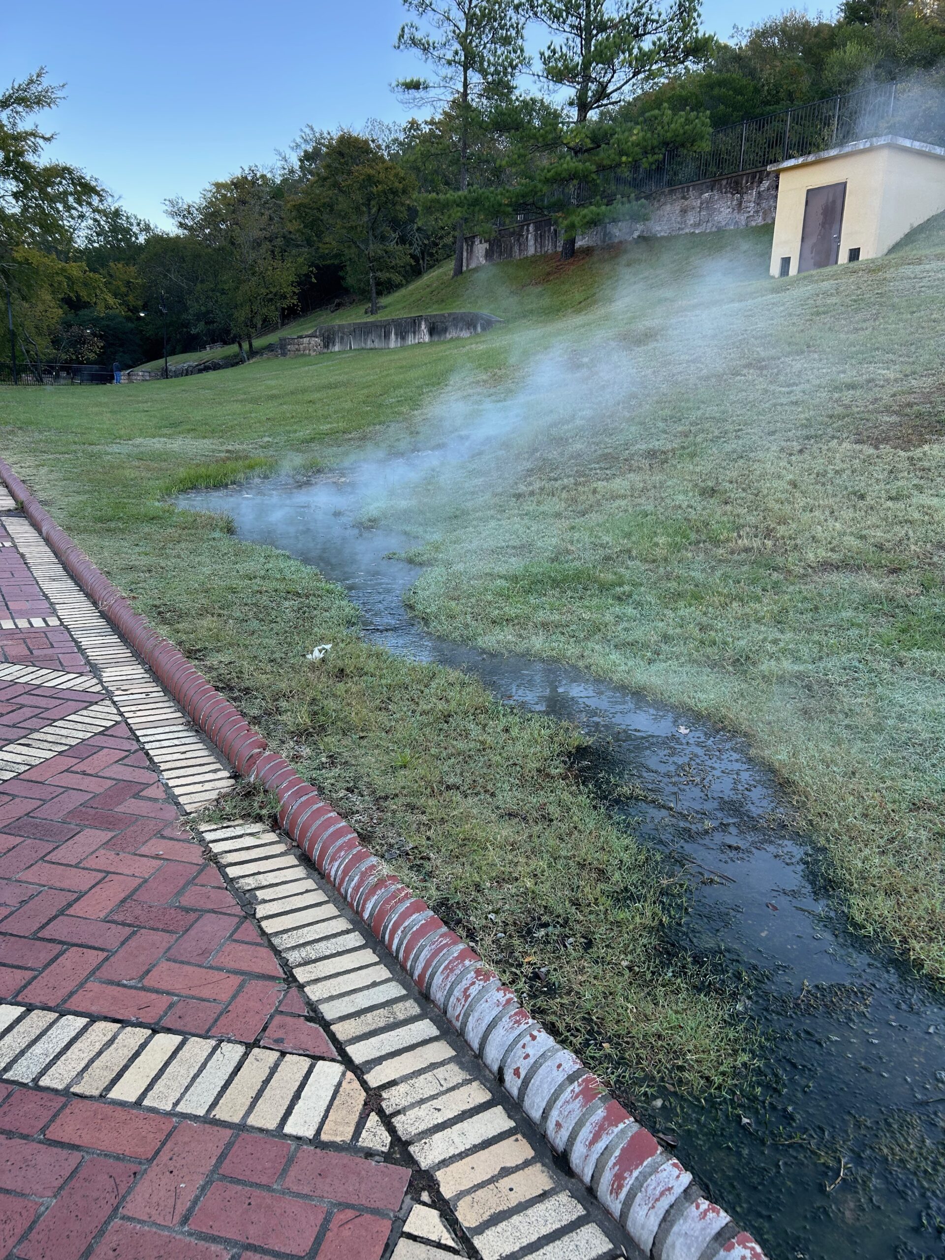 This is a view of the Promenade. This is a path that was built above the bath houses. The bath houses are situated at the bottom of a hill. Underneath the hot springs flow down and sometimes you can see them on the ground.