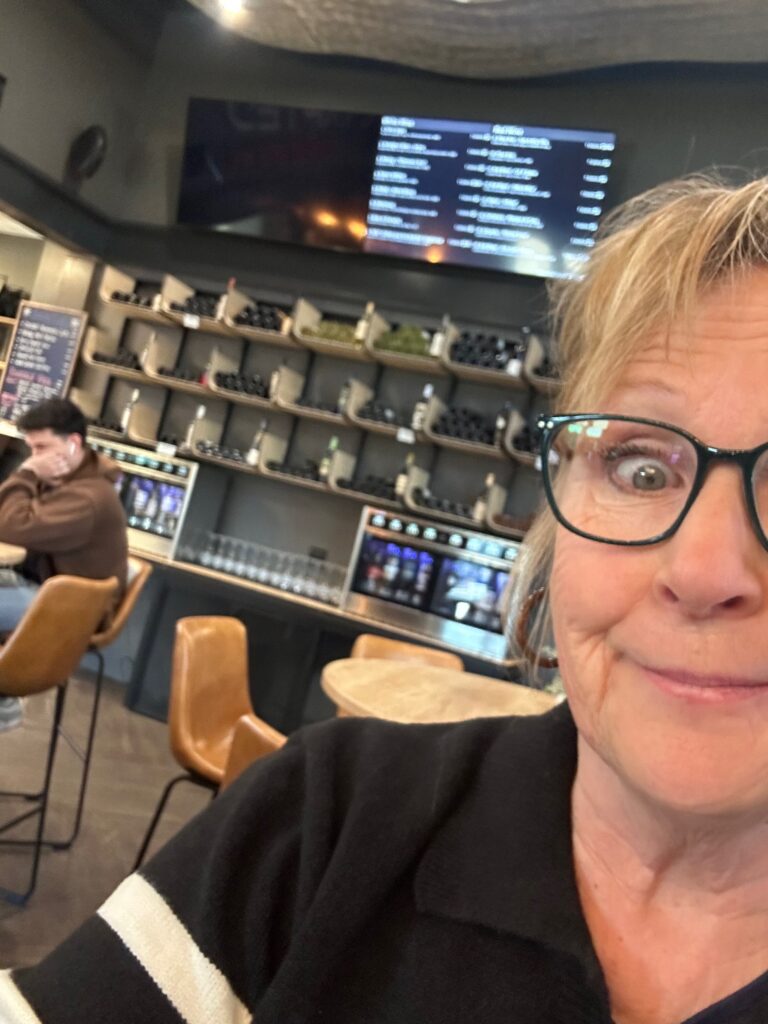 We are enjoying coffee and tea at a “third place” today. The washer was humming and the kitchen was cleaned up from breakfast when we left. And for those who zoom on photos, yes that is a wine bar behind me but have no fear. I am only enjoying a cup of Costa Rica here. Russ has a green tea.