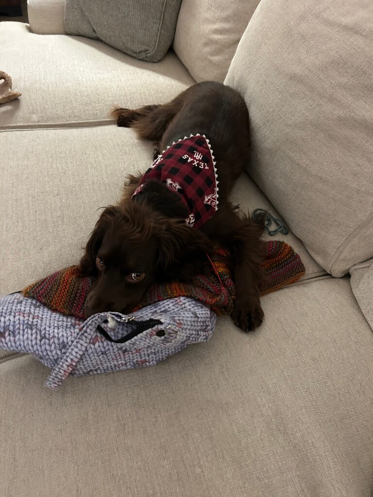 This l’il Aggie belongs to Shelly and Jack’s daughter Katy. Sadie barked vigorously at me for a few minutes and then cozied up. Occasionally she would forget who I was and would bark, but then it was back to BFF’s.