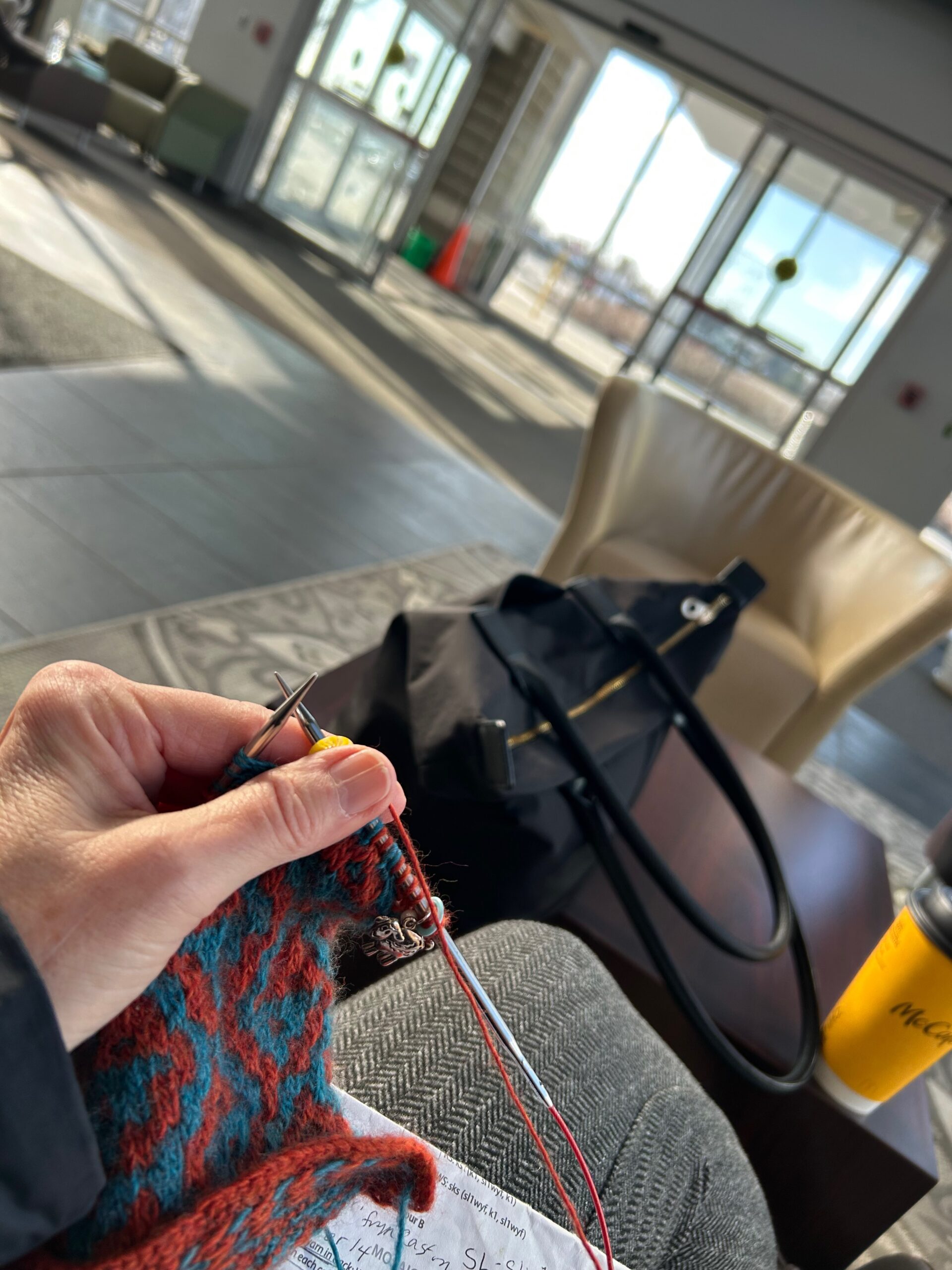 For me, I chose to brace myself when I saw someone would be heading in or out, reminded myself that the blast of cold was short and would be over quickly, and oh yeah…began studying the humanity that was passing in front of me as I sat and knitted.