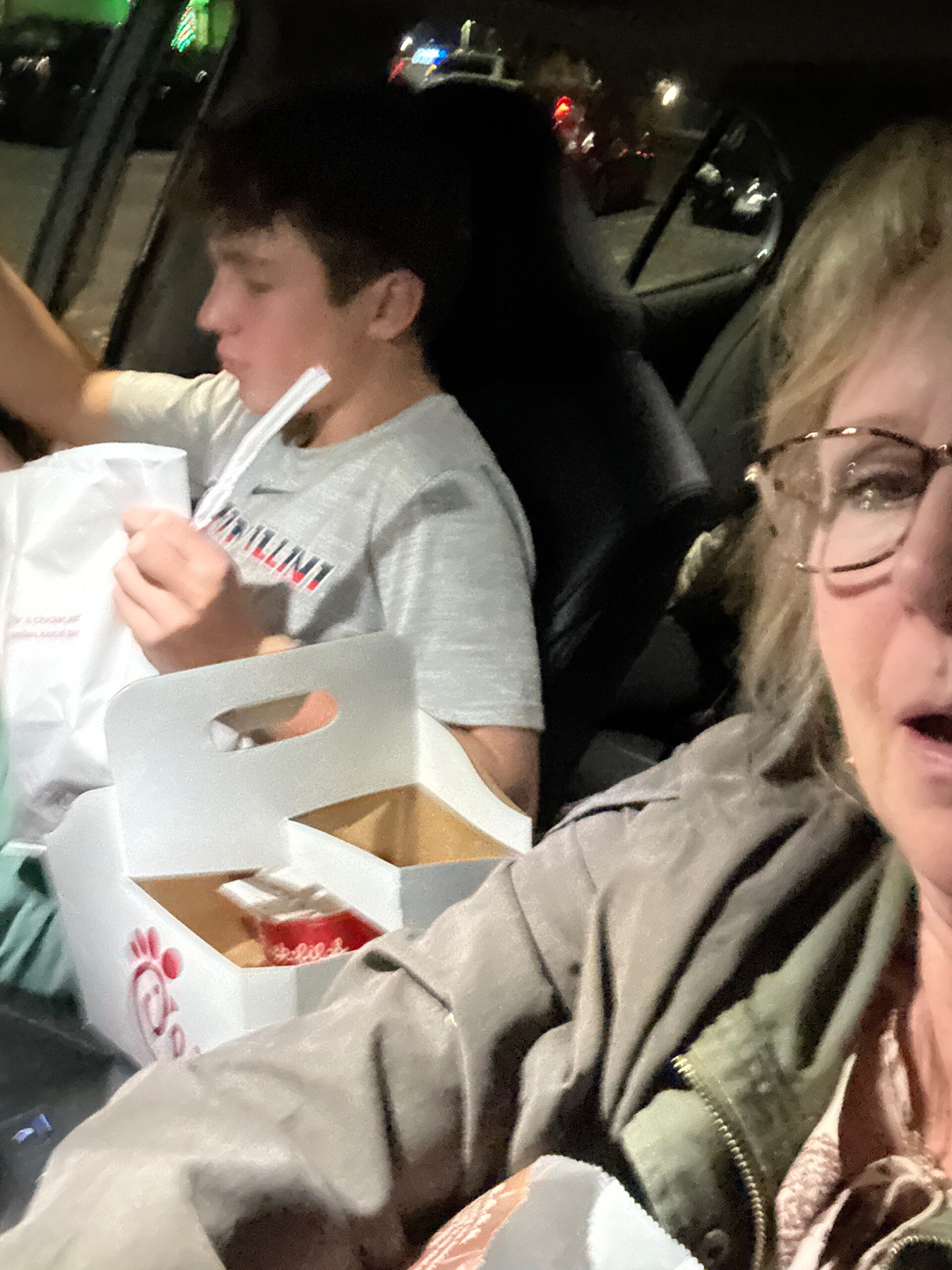 Chic-fil-A was their usual efficient selves and shortly after 6:30 I had passed a drink holder and two bags of food over to this man-sized human who was already having to squeeze his legs around his sports equipment bag in the front seat.