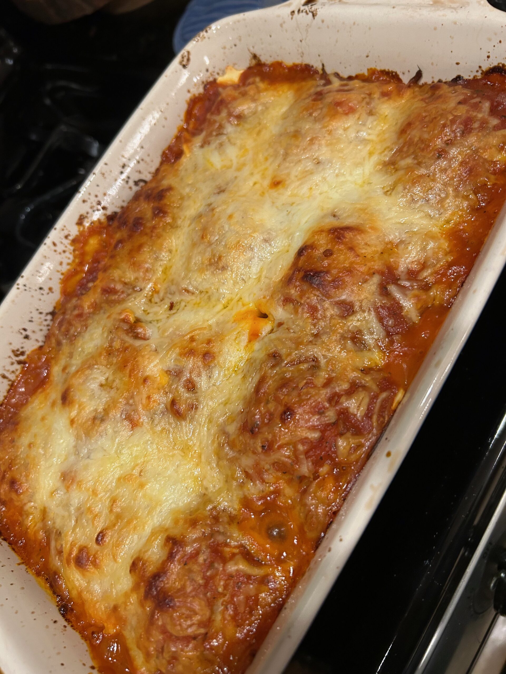 We had sausage and cheese ravioli from Sam’s club (not frozen). I used one container (a pound), one jar of sauce and a little more than half the cheeses for each layer. I did chop up about 3/4 cup of spinach/arugula mix and added to last layer of ravioli.