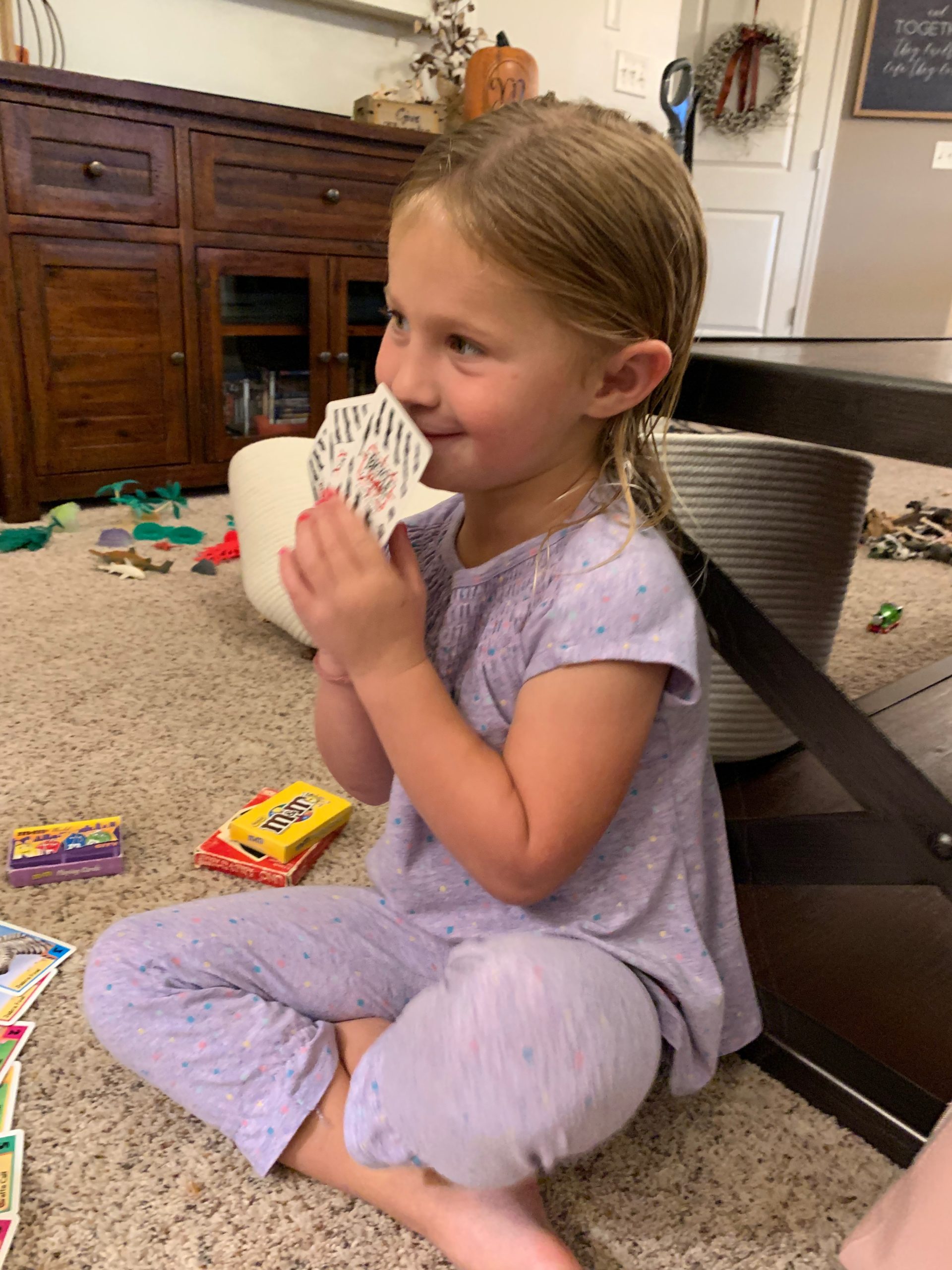 This little cutie figured out how to play her own hand at Go Fish last night.